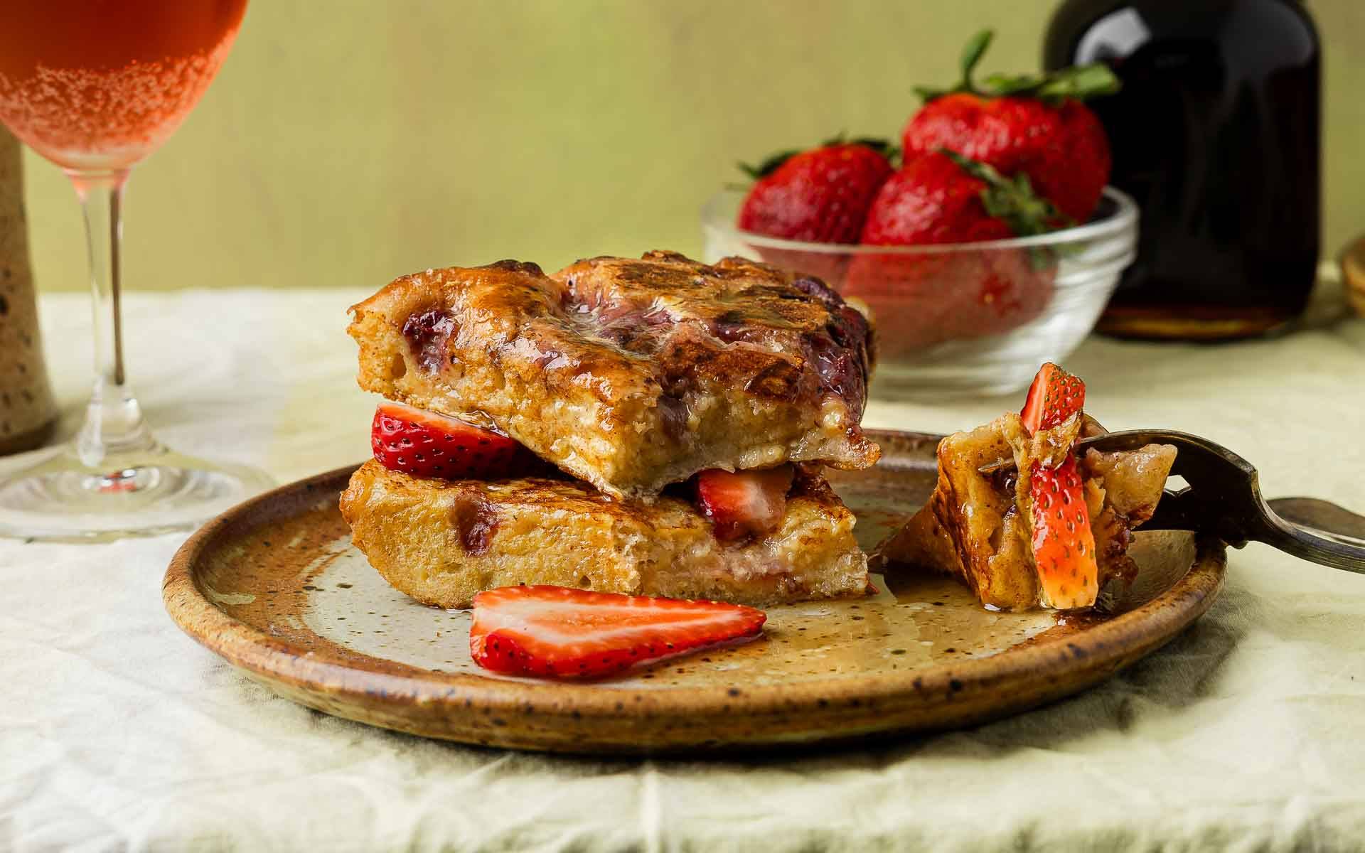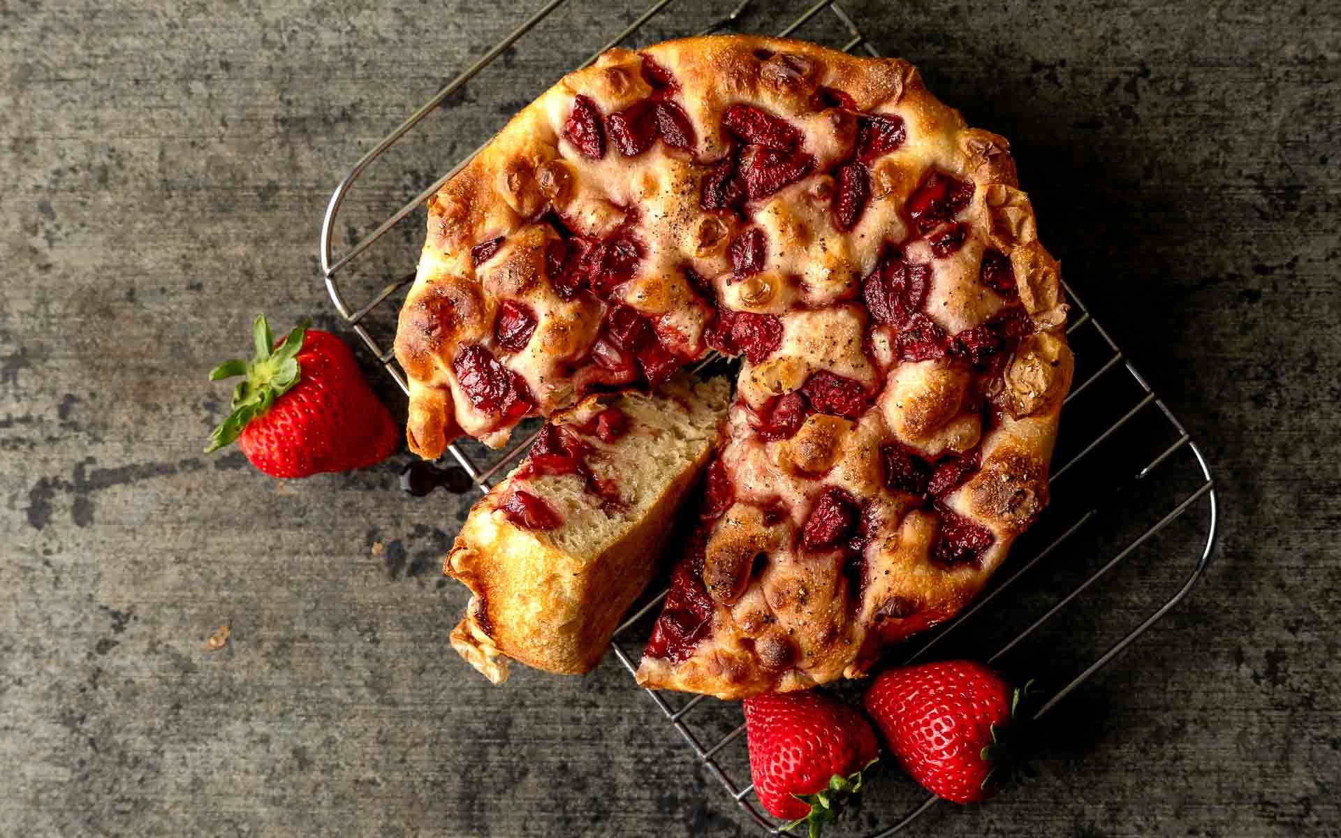 No, not socca with strawberries. That doesn't seem like an ideal combination- unlike strawberries and red wine which is. And that beautifully pillowy focaccia pictured above is topped with just that. Strawberries (not yet at the peak of the season but still delicious) oven roasted with red wine and just a touch of sugar. So good warm from the oven and slathered with goat cheese or sweetened up with maple syrup for a not your mommas but maybe for your momma French toast.